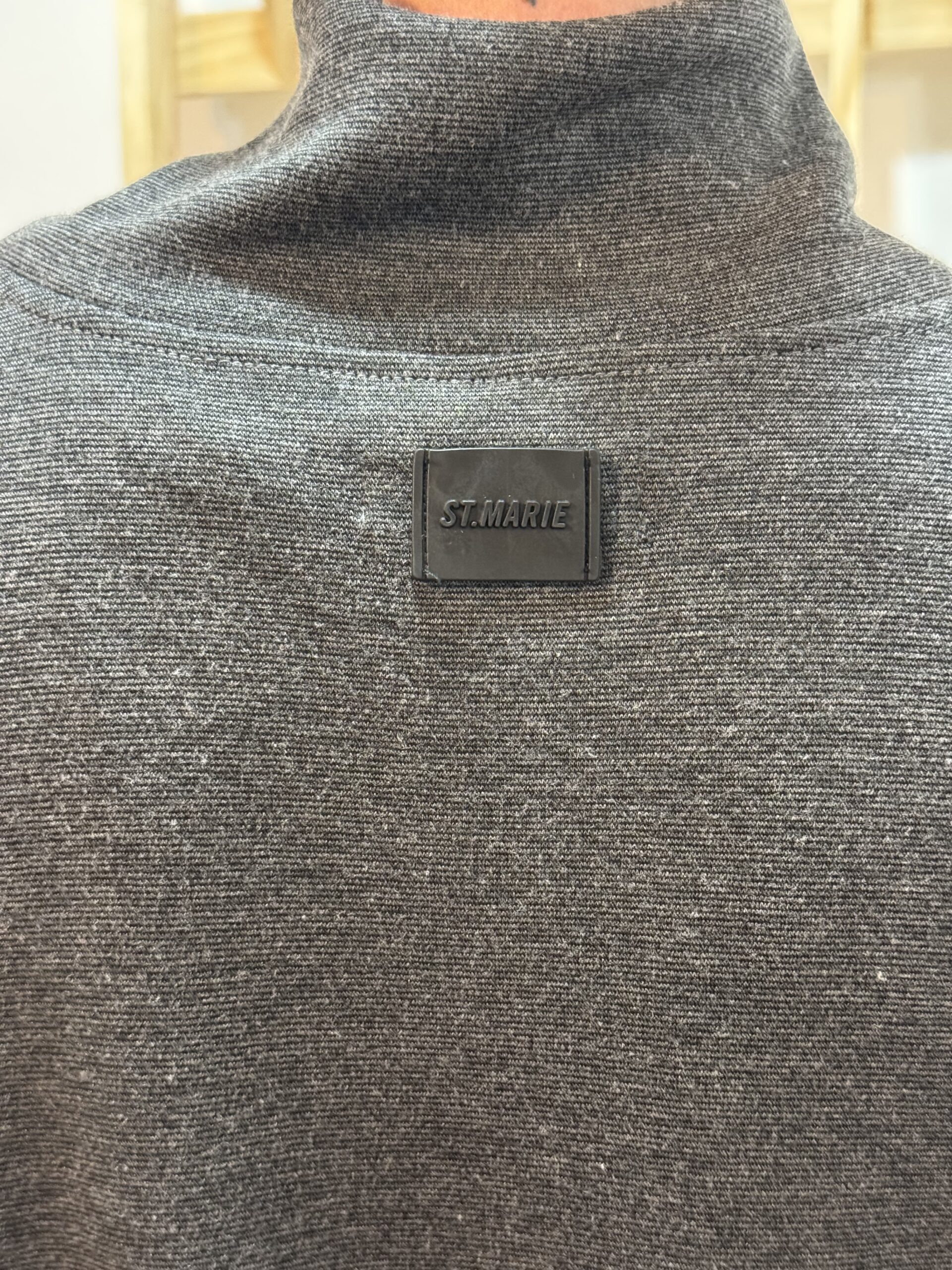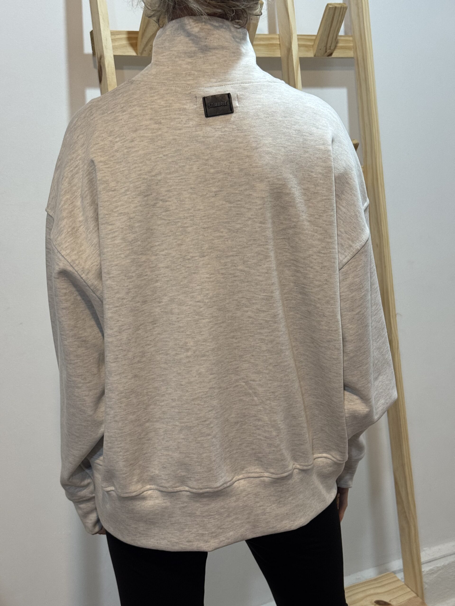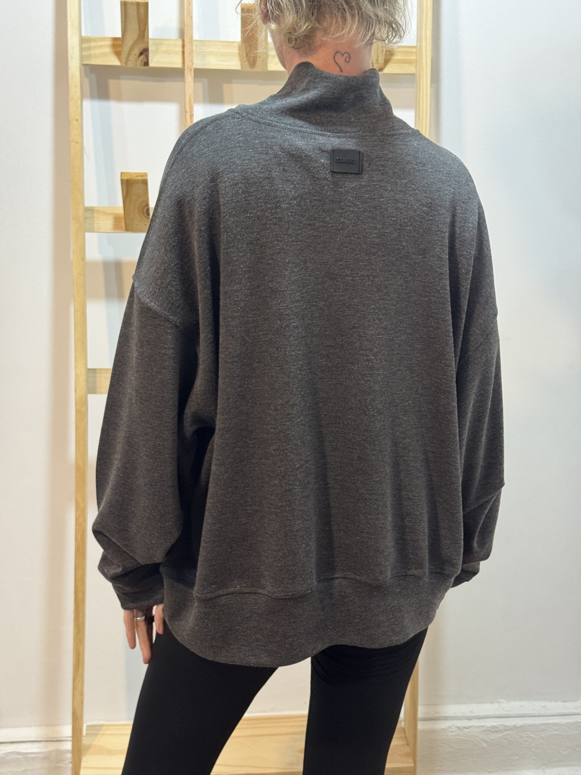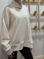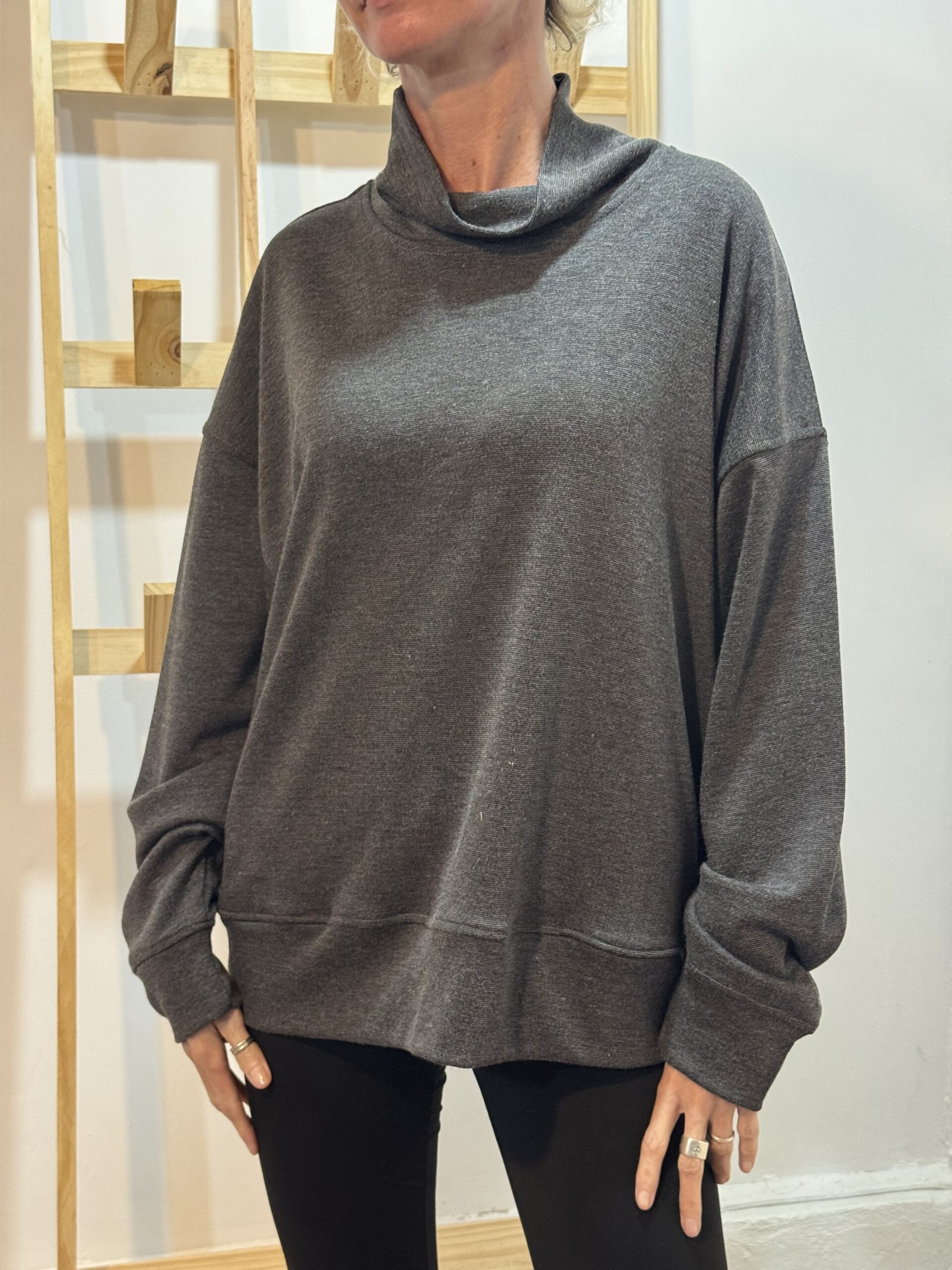 Buzo con puño en mangas y largo, bolsillos laterales y cuello polera amplia.
