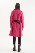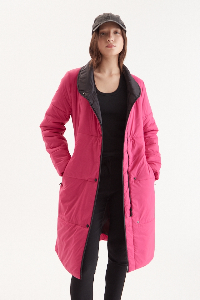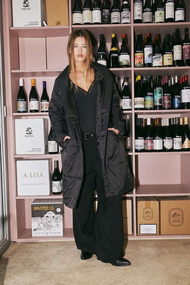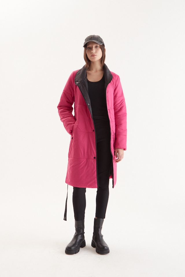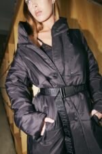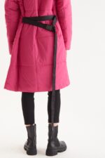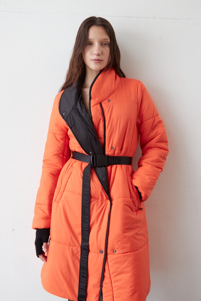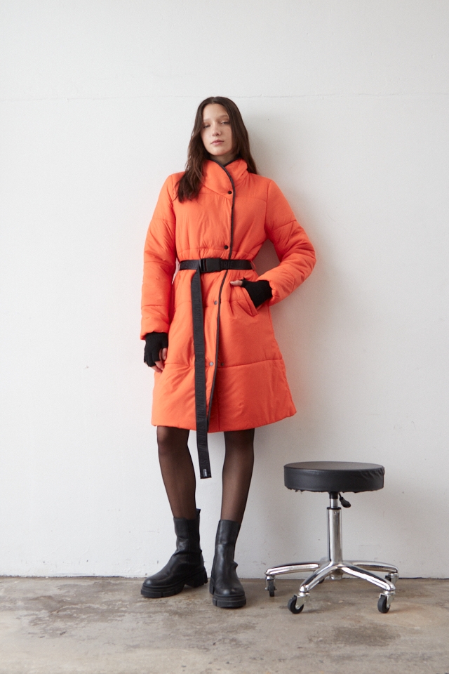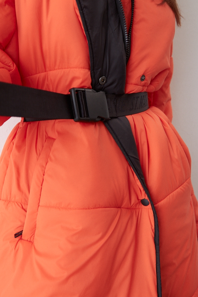 Campera puffer asimetrica con vivos y avios en negro. Cinturon ajustable de cinta tejida con logo. Broches y tiracierre con logo, largo pasando las rodillas.