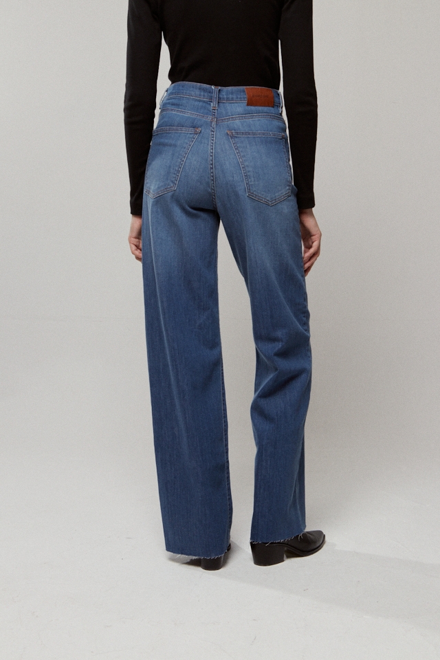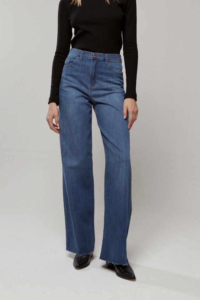Calce wide tiro alto elastizado 5 bolsillos. Largo al tobillo y ruedo al corte.