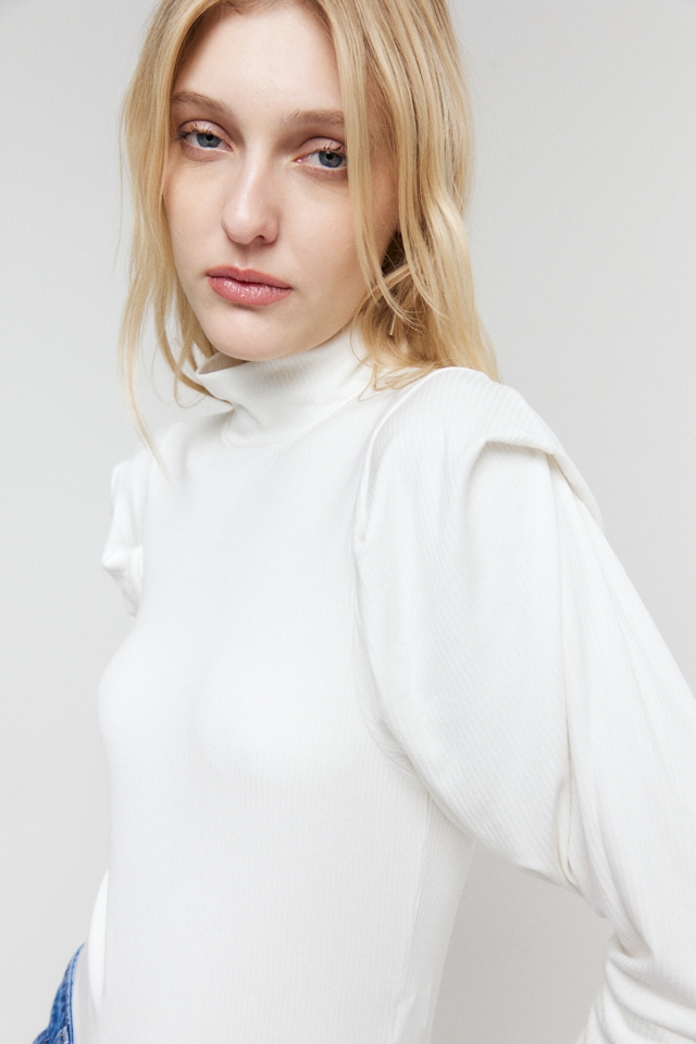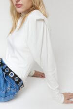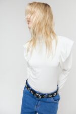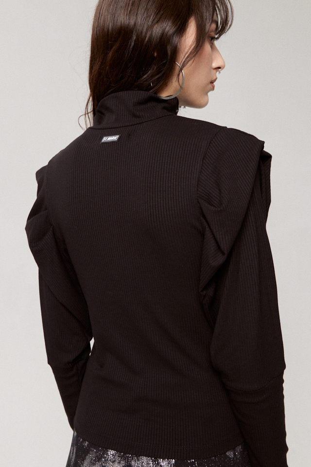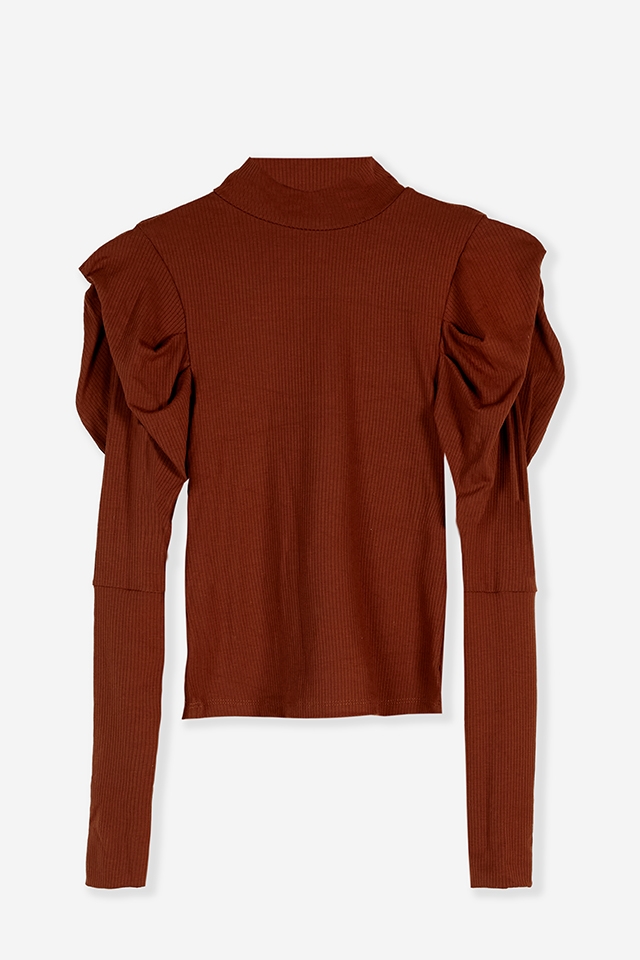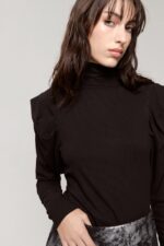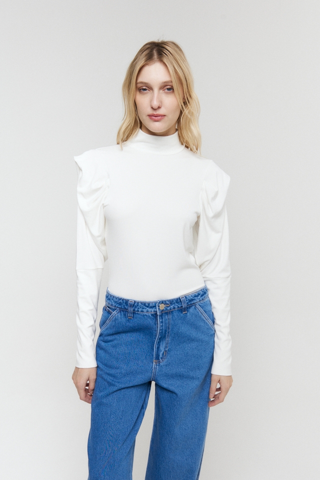 Polera manga larga de morley con detalle de volado en manga y etiqueta de goma en espalda.