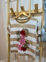 Remera de algodon a rayas con estampa y cuello con detalle