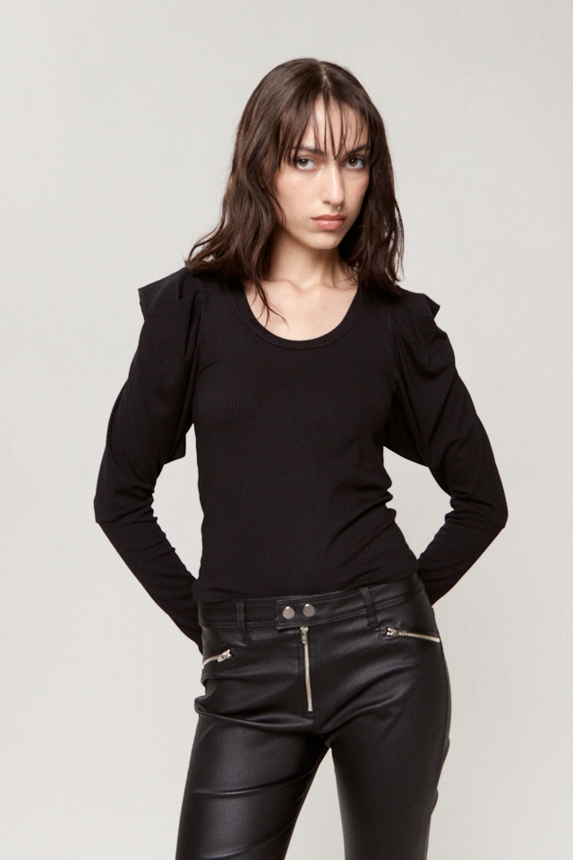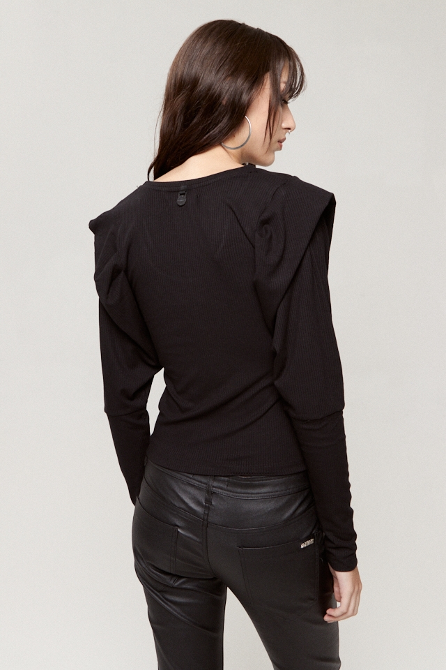 Remera manga larga escote en U de morley con detalle de volado en hombro y detalle de chapita personalizada en espalda.