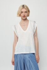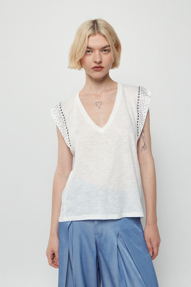 Remera con hombros prolongados y escote en V, apliques en hombros.