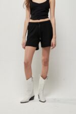 Short en waffle liso, cintura con elastico y cordón regulable. Etiqueta de ecocuero.