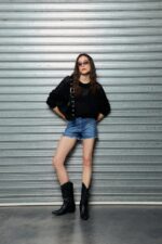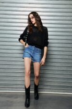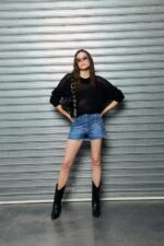 Calce slim elastizado 5 bolsillos con ruedo desflecado y tajos laterales.