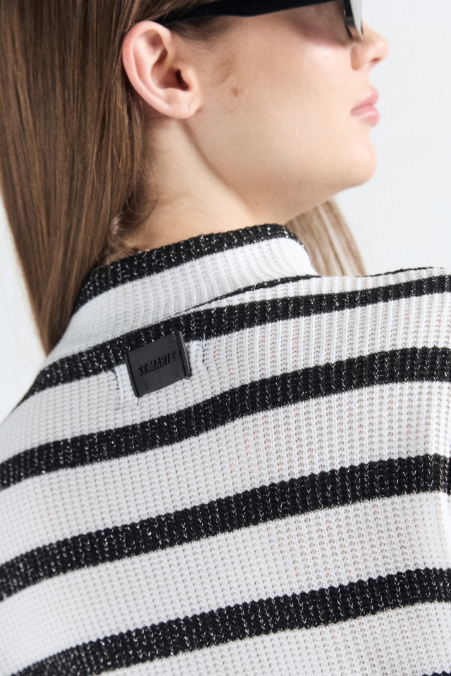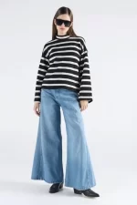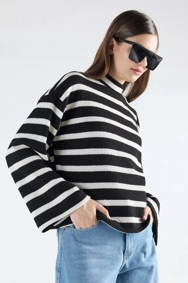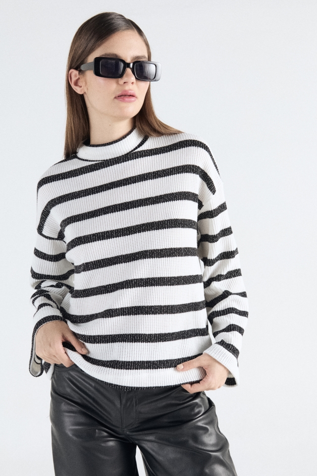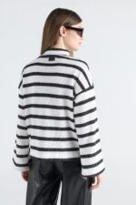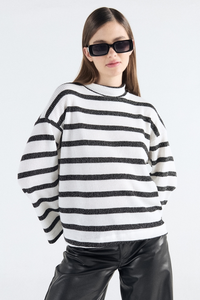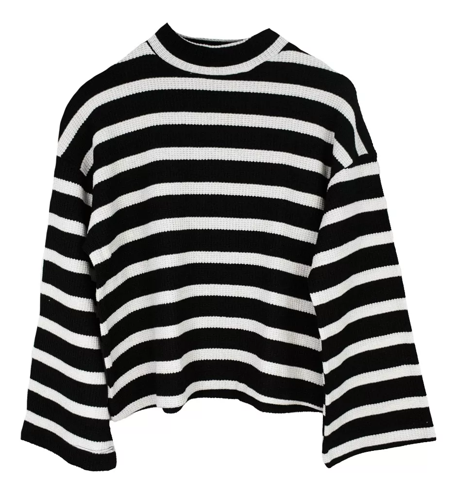 Buzo media polera tejido rayado, manga acampanada y badana de goma en espalda